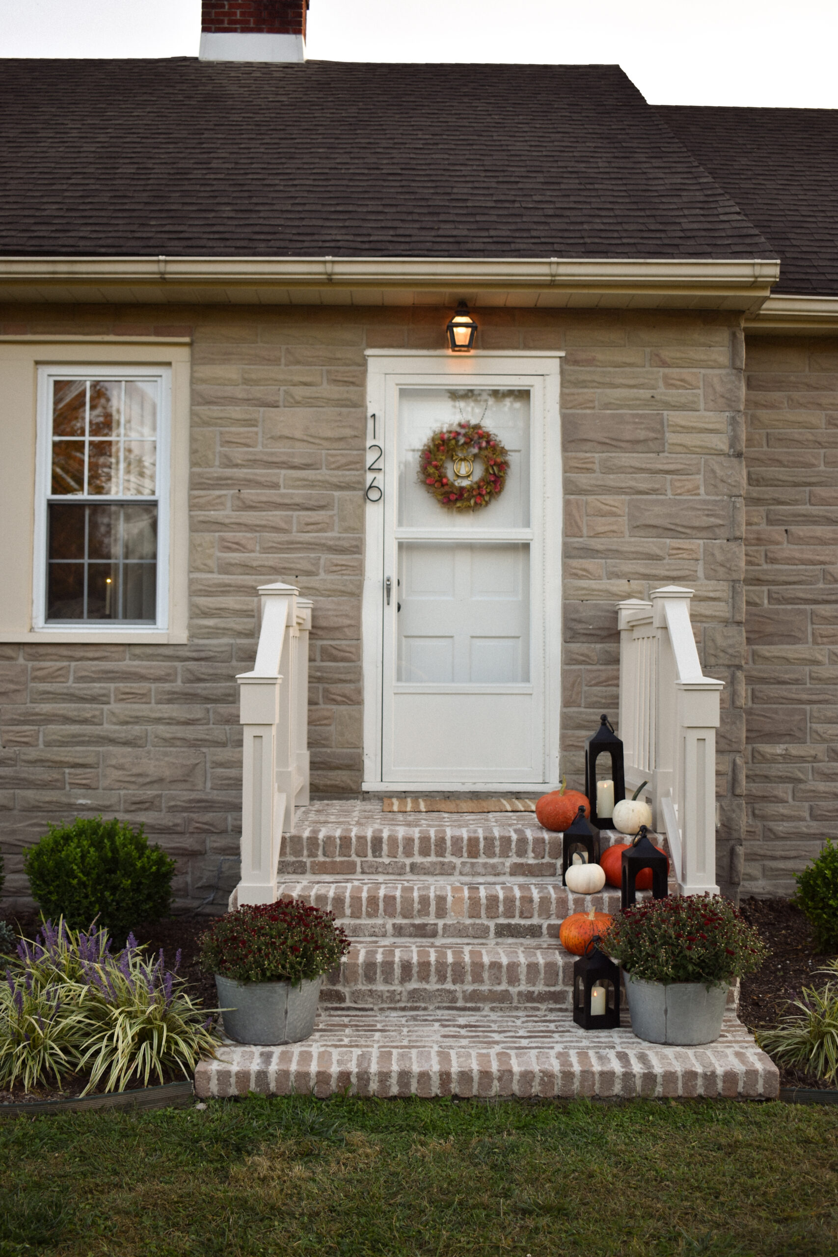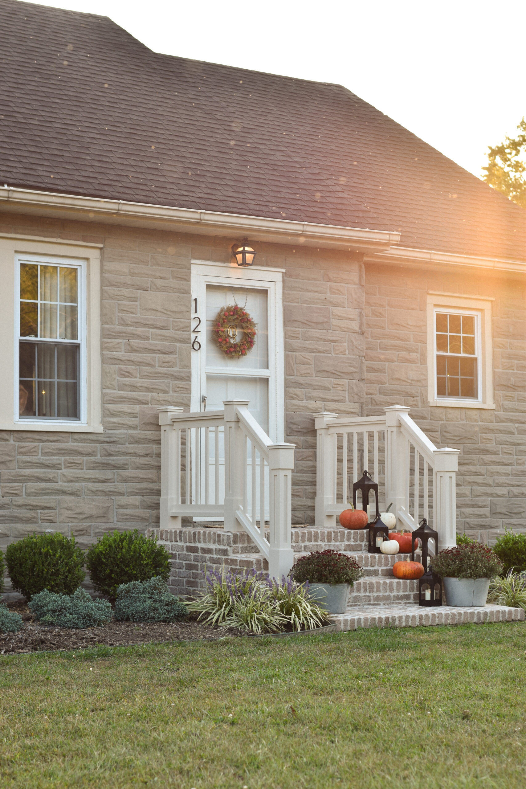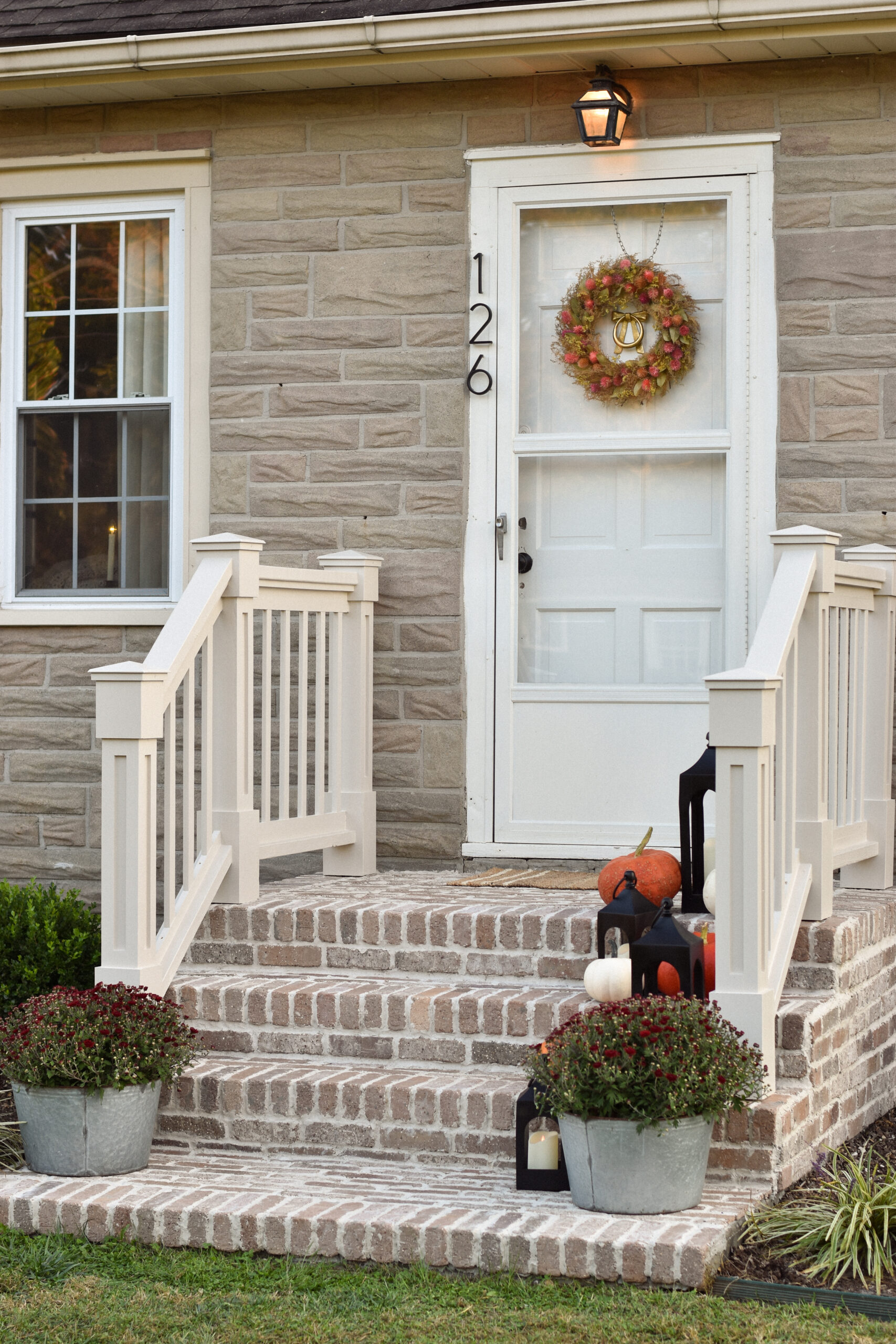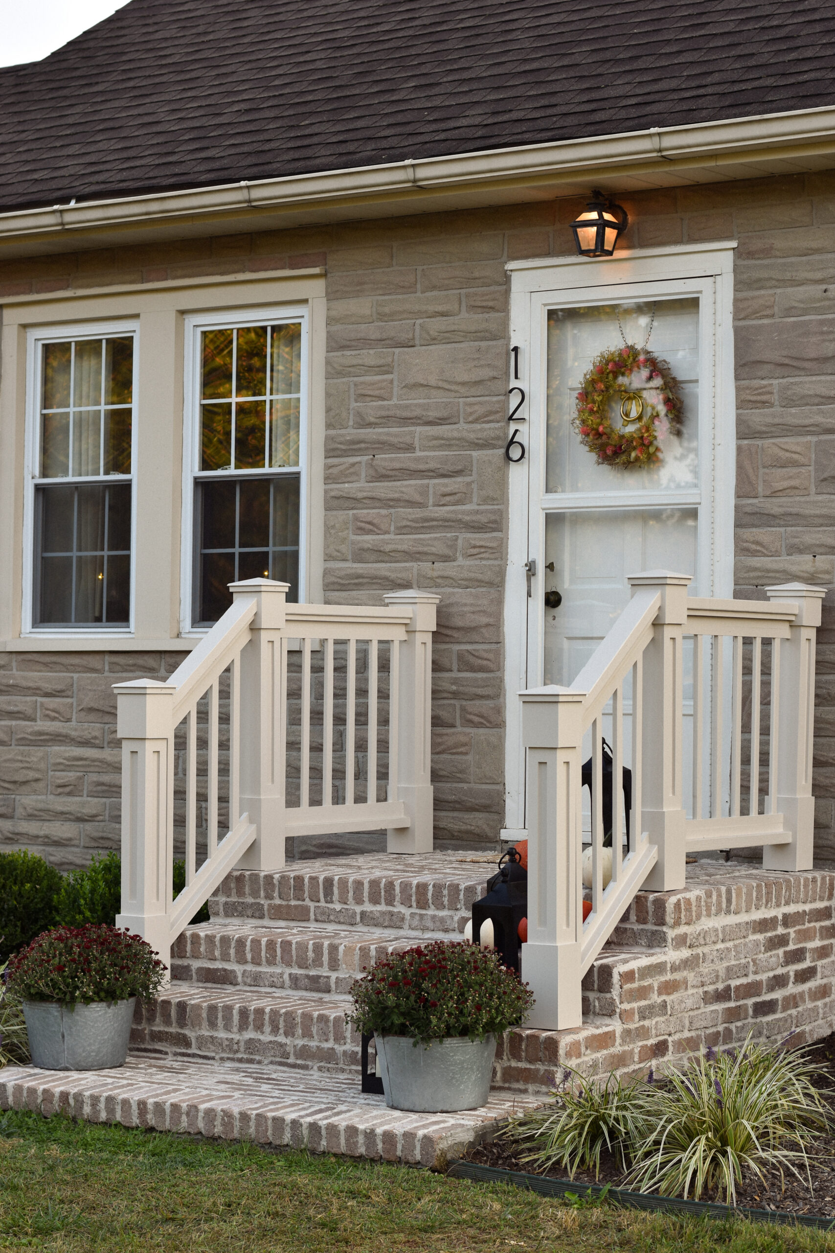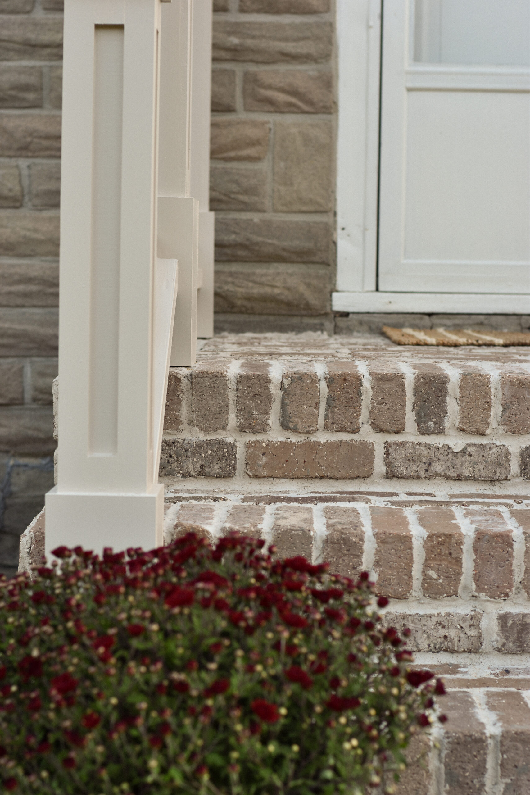 Building our own railing was a challenge, but totally worth it. It added so much warmth and curb appeal to the front of our house. The brick steps, the trim details, the soft paint color, it all just came together perfectly and I am so excited to decorate this space for the seasons!!
