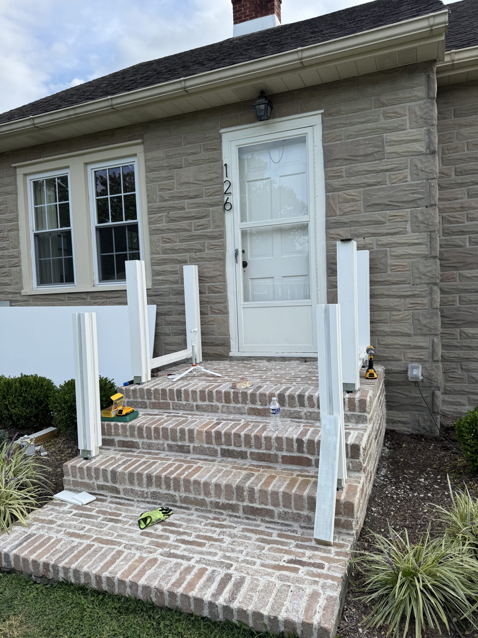 I can’t believe this project is finally done! What started as a simple railing replacement turned into one of our biggest DIYs yet – and honestly, one of my favorites. If you’ve been following along, you know this was a true labor of love. From ripping out the old railing to bricking our steps and building custom posts, I’m so proud (+ also a little surprised lol) to say that we did it all ourselves!!