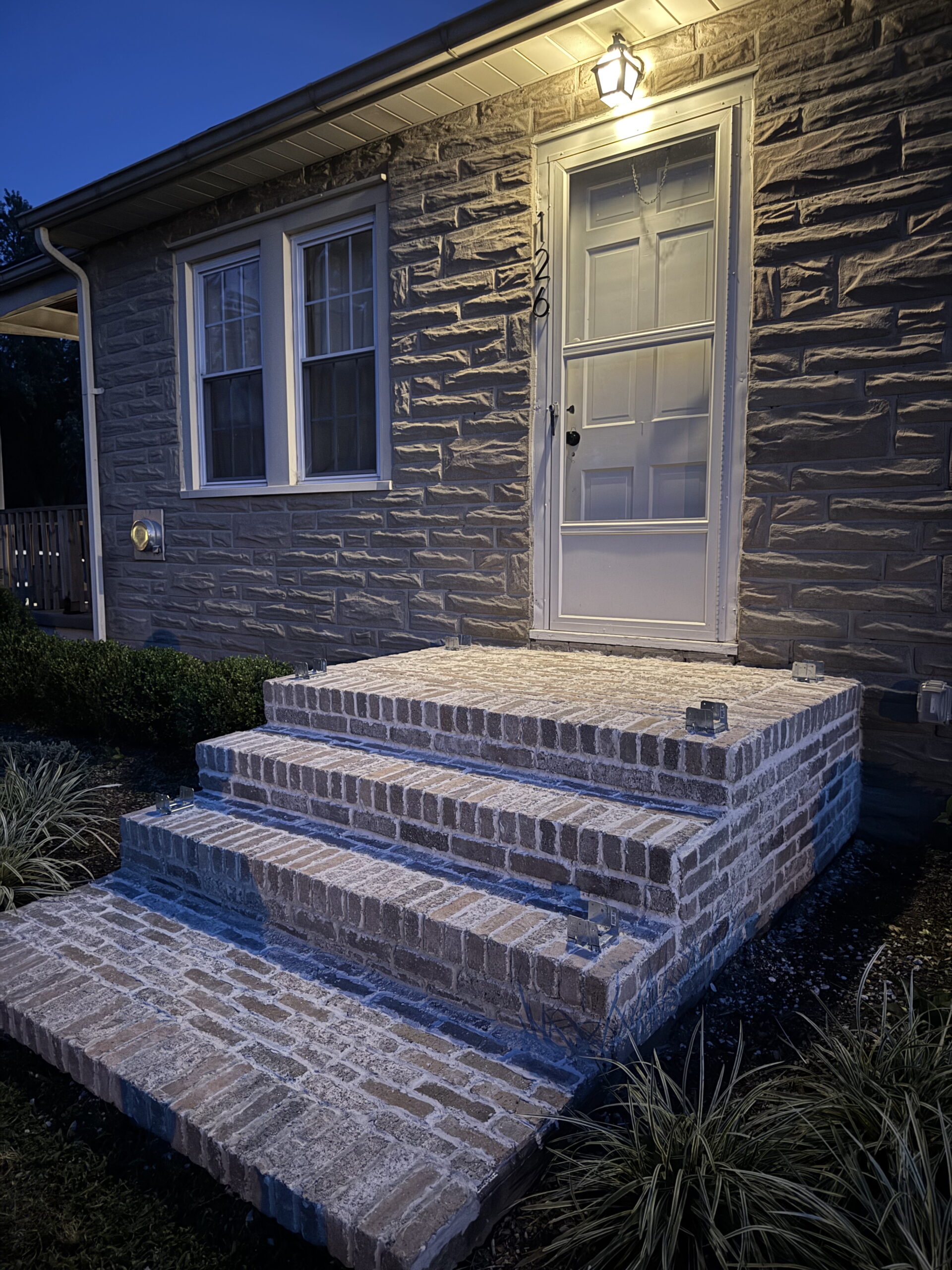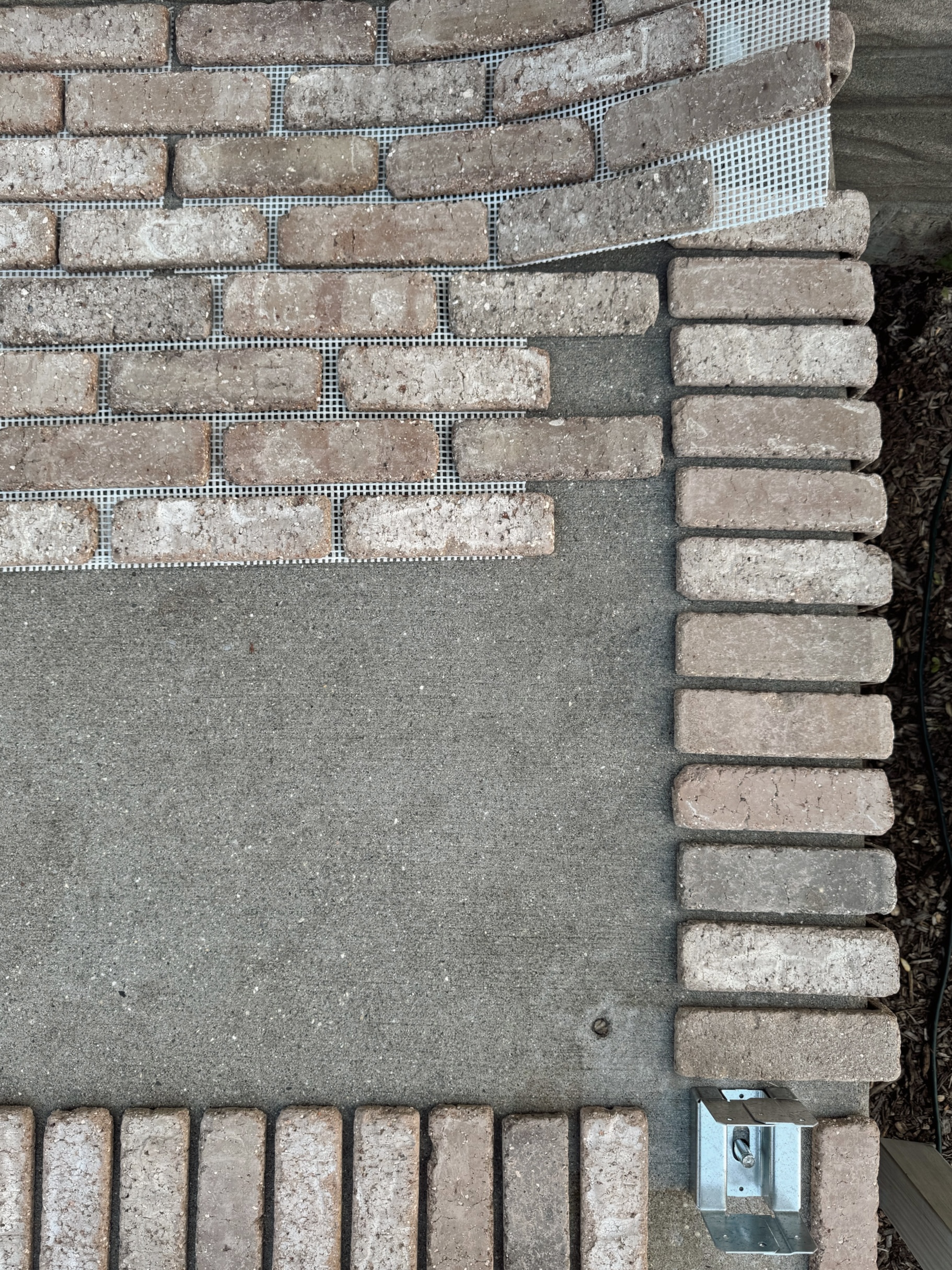 We decided to add a brick border along the top landing of the steps and I love how it gives that space its own little ✨moment✨. Because all the cuts were done ahead of time, the process went quickly. The sides of the steps were a little trickier since we had to hold the brick sheets in place while the mortar set, but we got it done!